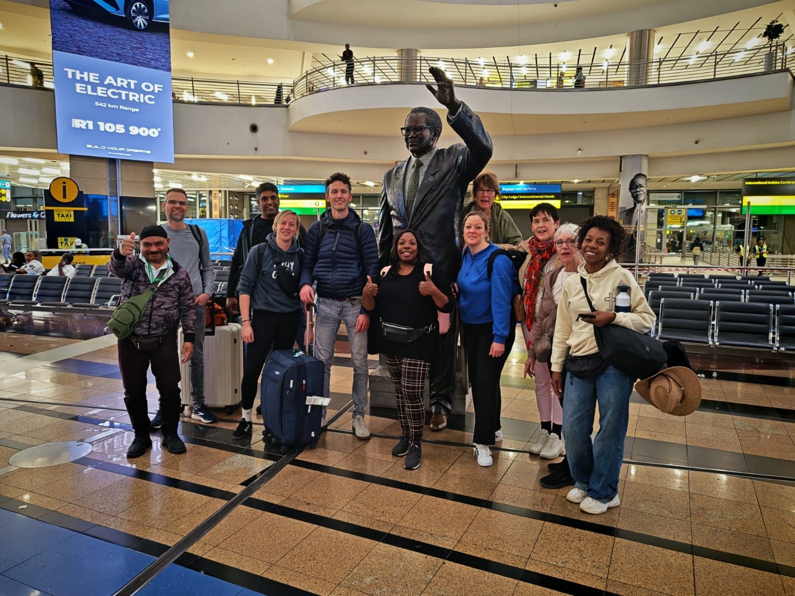 Om 7.30 uur stonden we aan de start van ons avontuur naar Zuid-Afrika, in vertrekhal 2 bij balie 9, om als groep