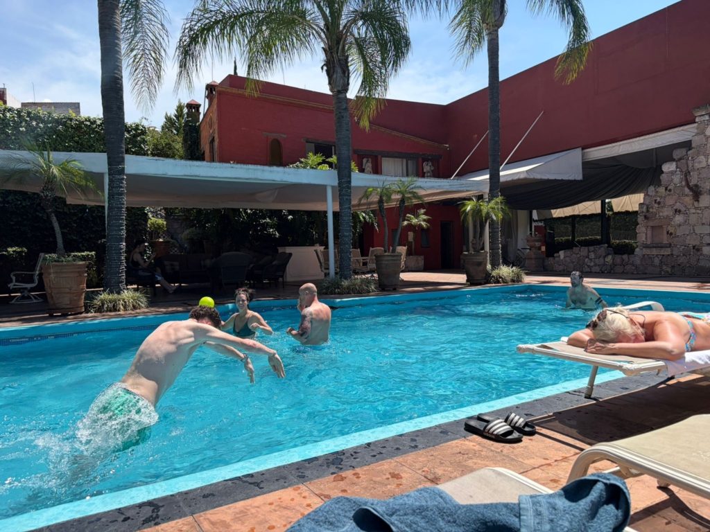 Toen we thuis waren, hadden we even vrije tijd. We maakten er een plons in het zwembad van.