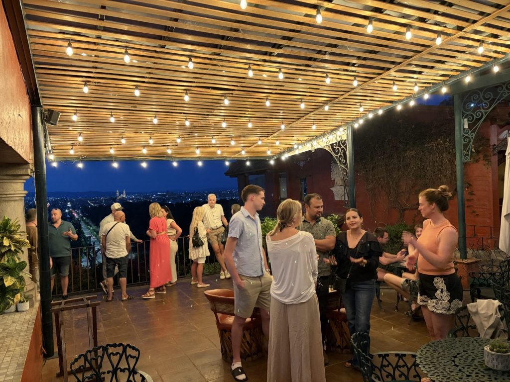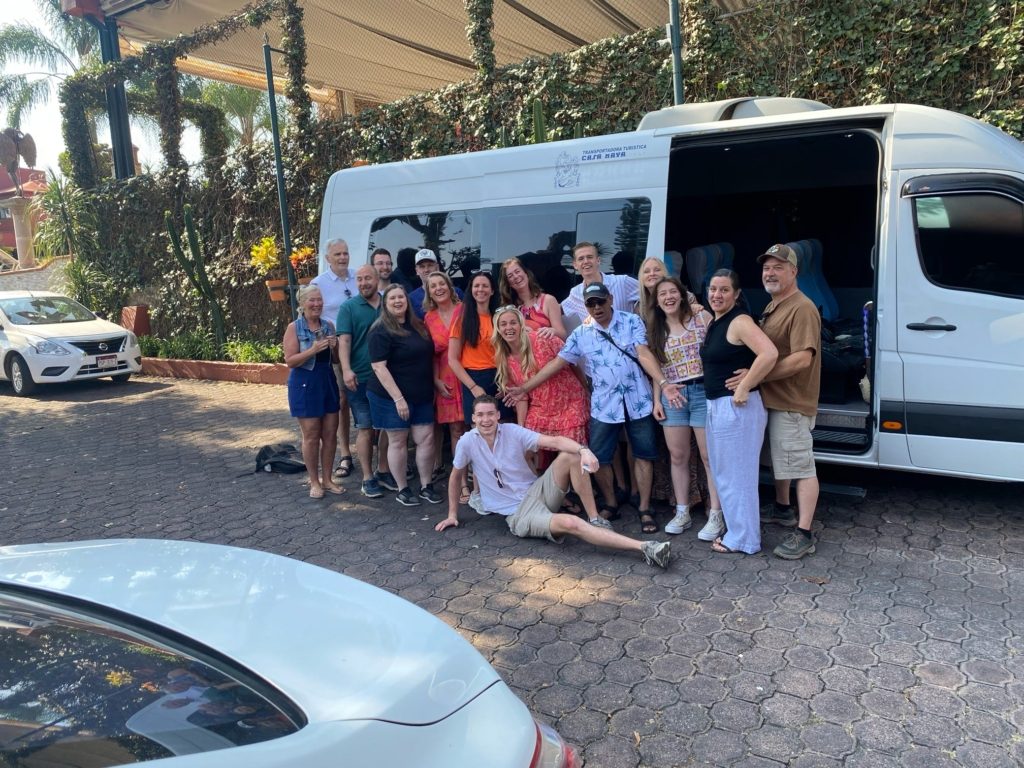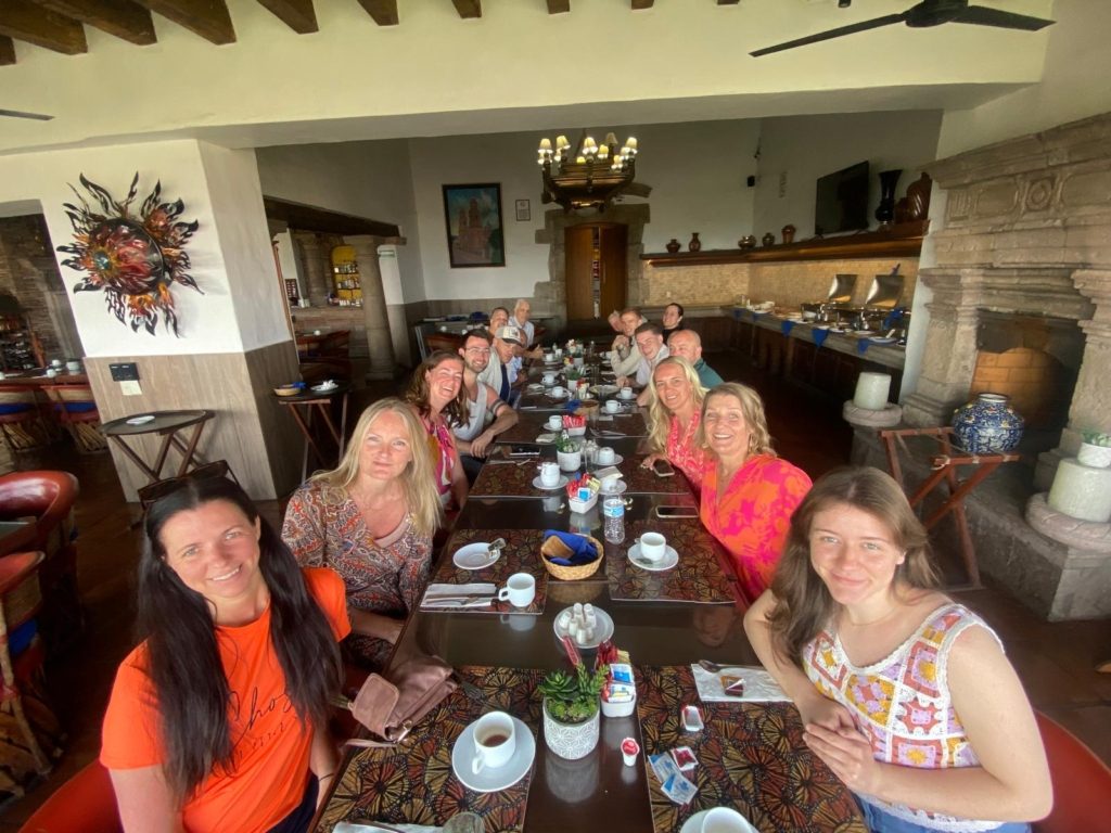 (We vragen nog even een groepsfoto bij het ontbijt — als je goed kijkt, zie je allemaal rode, verbrande hoofden. We zijn dichter bij de zon door de hoogte, en dat hebben we gemerkt 😅.)