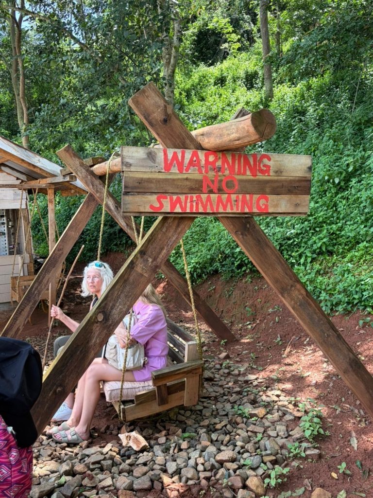 We werden naar een uitzichtpunt geleid. Via een bruggetje kwam je op een soort eilandje van waar je een mooi uitzicht had op de rivier. Toen vroeg een gids of er iemand was die wilde zwemmen. En dat wilde ik wel. Even het zweet van me afspoelen en wat verkoeling. Dus samen met nog zes anderen gingen we de gids achterna. Bleek dat het de bedoeling was dat je in die zwembandjes ging zitten. Maar ja, nu kon ik ook niet meer terug, vond ik. Dus hup, in die band!