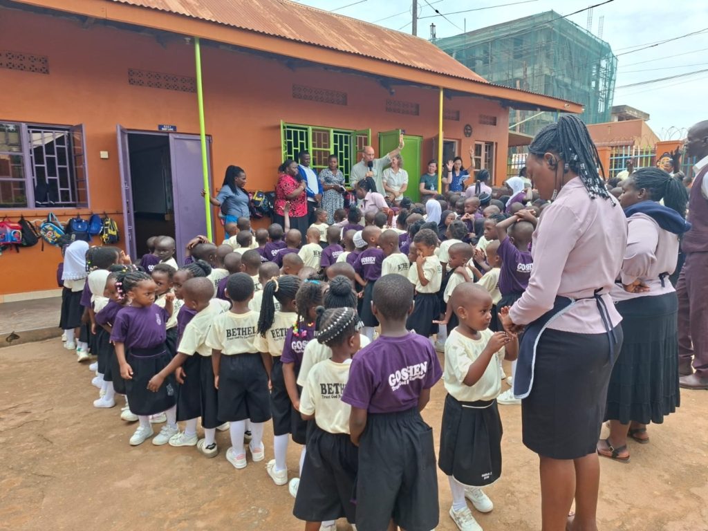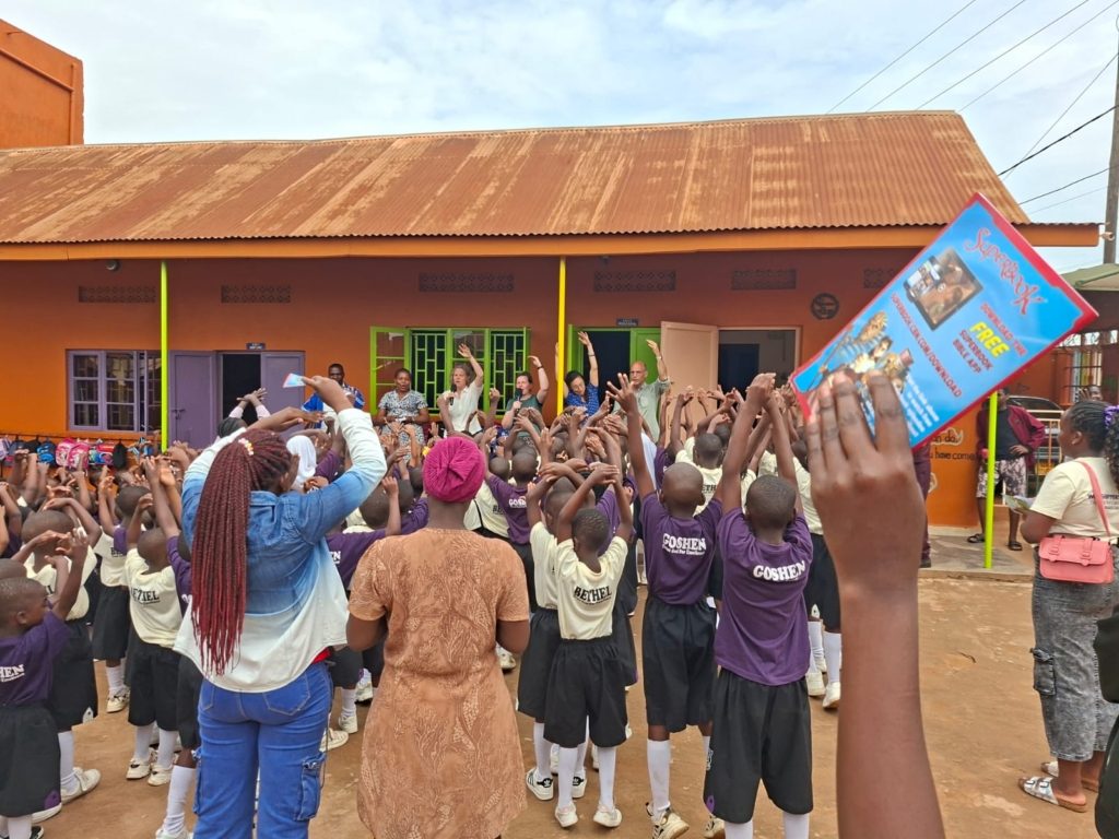 Eenmaal aangekomen, na een lange bumpy road en licht misselijk, begint onze ochtendactiviteit. Die bestaat eerst uit een bezoek aan een basisschool genaamd “Plucky”. Hier heeft Michelle verteld over of je het zware gewicht van zonde wilt dragen of het lichte gewicht van genade. Zij doet dit met een voorbeeld door middel van een zware rugtas en een lichte ballon. Ze daagt de kinderen uit om dit door te vertellen aan anderen. Opvallend zijn de prachtige kleuren van de schooluniformen en de kleurrijke gebouwen.